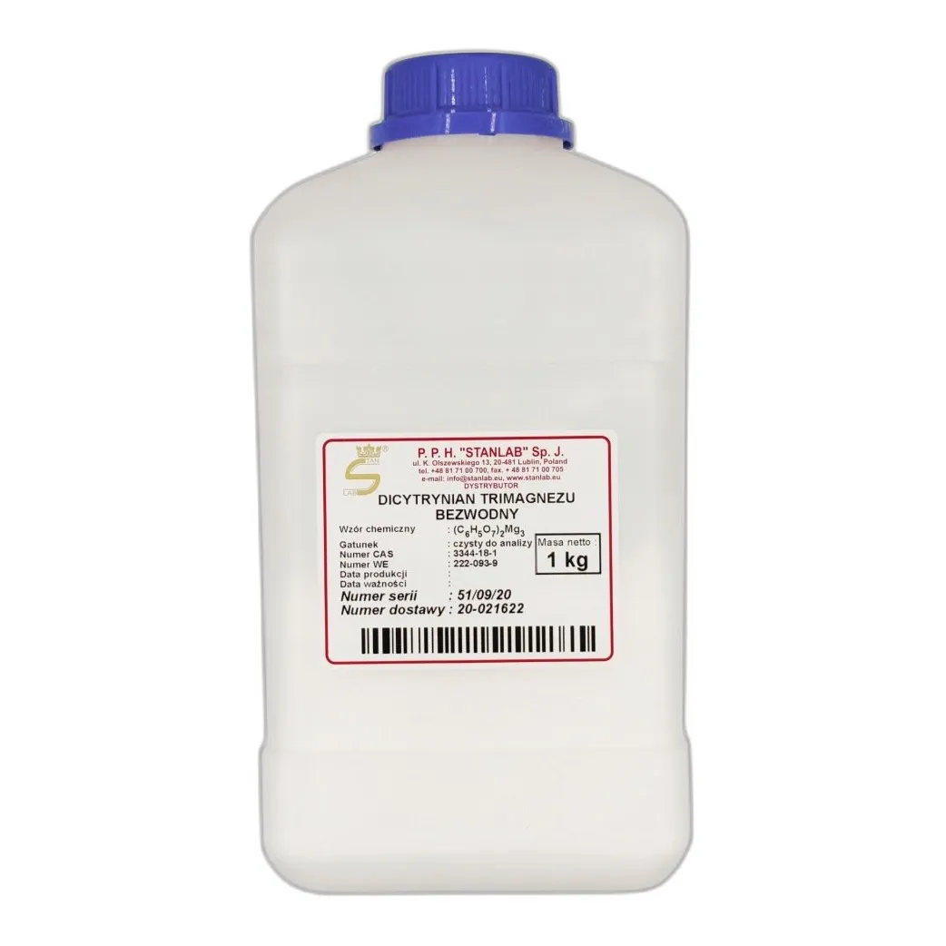 Dicytrynian trimagnezu bezwodny jest solą o wysokiej czystości i stabilności. Czy wiesz, że jego temperatura topnienia wynosi około 250°C? Jego rozpuszczalność w wodzie jest ograniczona, co sprawia, że jest on często stosowany w reakcjach organicznych.