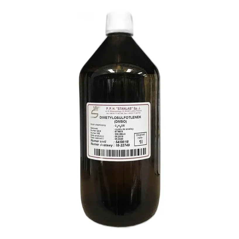 DIMETYLOSULFOTLENEK DMSO Stanlab SZKŁO (C2H6OS) powszechnie znana jako DMSO to odczynnik chemiczny przeznaczony wyłącznie do zastosowań laboratoryjnych, badawczych i profesjonalnych.