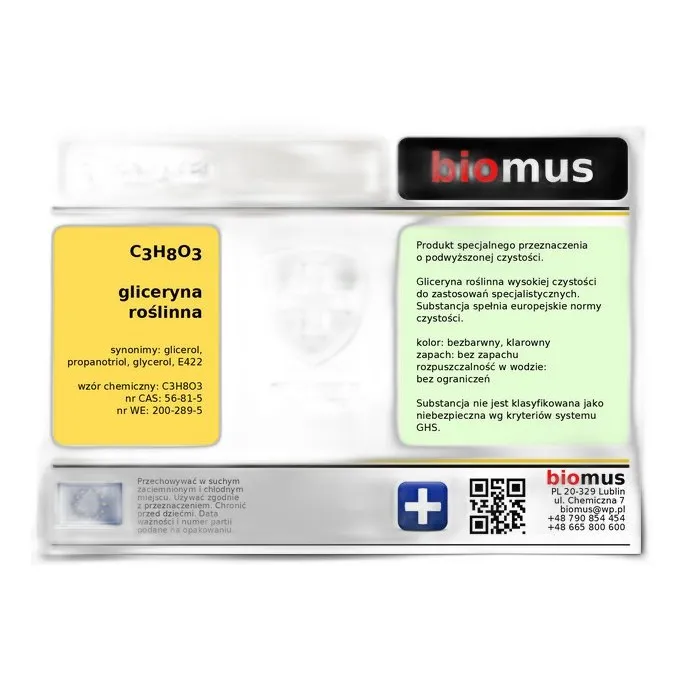 Substancja propano-1,2,3-triol jest jednoznacznie identyfikowana przez numer CAS 56-81-5, wzór chemiczny C3H8O3, nazwa łacińska Glycerolum. Powszechnie znana również jako: glicerol, gliceryna. Te identyfikatory pozwalają zweryfikować autentyczność produktu w międzynarodowych bazach chemicznych takich jak PubChem (NIH/NLM) oraz Common Chemistry (CAS). Każda partia produktu opatrzona jest dokumentacją zgodną z wymogami REACH (WE) nr 1907/2006.