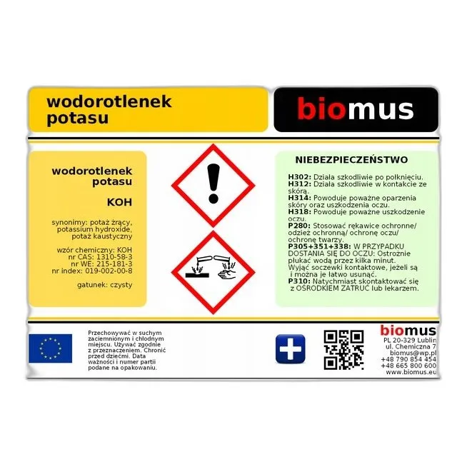 Substancja wodorotlenek potasu jest jednoznacznie identyfikowana przez numer CAS 1310-58-3, wzór chemiczny HKO, nazwa łacińska Kalii hydroxidum. Powszechnie znana również jako: potas żrący, ług potasowy. Te identyfikatory pozwalają zweryfikować autentyczność produktu w międzynarodowych bazach chemicznych takich jak PubChem (NIH/NLM) oraz Common Chemistry (CAS). Każda partia produktu opatrzona jest dokumentacją zgodną z wymogami REACH (WE) nr 1907/2006.
